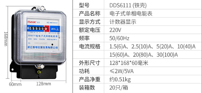 DDS6111型單相電子式電能表,由于采用集成電路和SMT制造工藝,使之測量準確度,穩定性等均得到了可靠保證.適用計量額定頻率為50Hz,額定電壓為220V的單相交流有功電能.